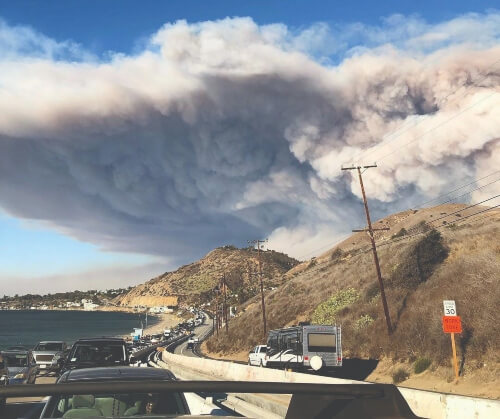 A large smoke plume from the Woolsey Fire encroaches on Malibu Nov. 9, 2018, as residents evacuate.